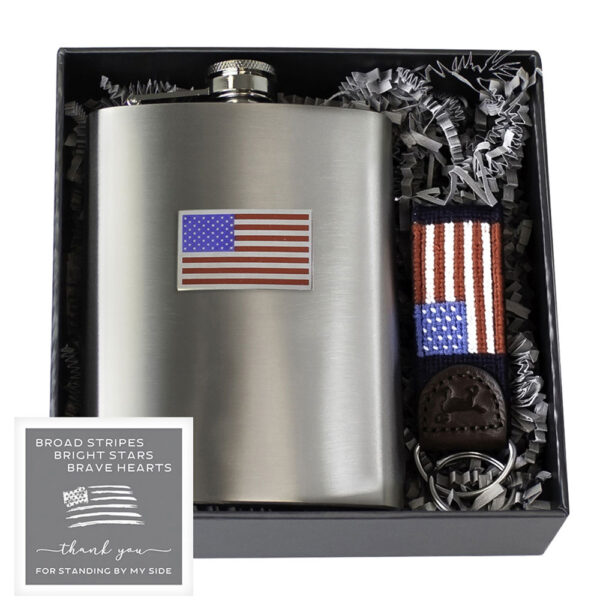 Proud patriots will love this fun American flag flask and key fob gift set.  Your groomsmen are your brothers one way or another.  Whether you serve, protect, save lives, or just share a love for this beautiful country with your brothers, this stunning set really shows your appreciation.  Includes a thank you card so you won’t forget: “Broad stripes, bright stars, brave hearts.  Thank you for standing by my side.”