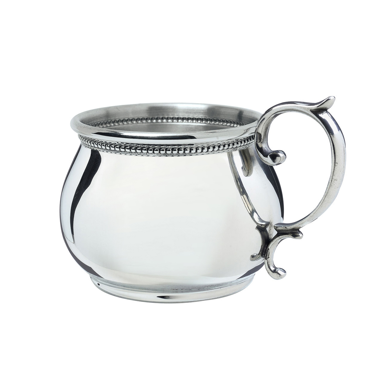 Need a baby cup that’s nothing short of spectacular? The bulged cup belly, with it’s ornate scroll handle and fancy beaded lip make this little U.S. handmade pewter cup the most unique one of the bunch.