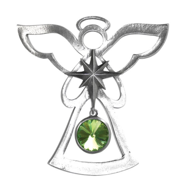 Who wouldn’t want an angel to watch over them? Beautiful handcrafted pewter angel ornaments are a great way to keep those angels close at hand whether on the tree at Christmas or around the house any time of year. The sparkly August Peridot-colored birthstone jewel adds a splash of color and personality!