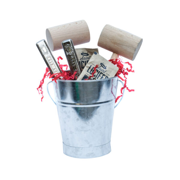 - 2 knives, 2 mallets, St. Lucifer Seafood Spice packet, pail