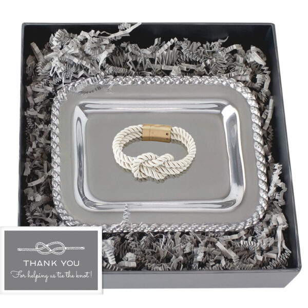 Without great bridesmaids, who would be there to anchor you on your wedding day? Thank them for standing by you with this handcrafted Masthead tray and knot bracelet. The included thank you message says “Thank you for helping us tie the knot!”.