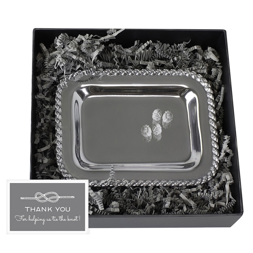 Groomsmen: A group of your tightest friends showing the ultimate act of caring by standing by you on your wedding day. Show them some love with an unforgettable stunning gift! The attractive handcrafted Masthead tray and knot cuff links make a strong impression. Of course you need a card too! This one says “Thank you for helping us tie the knot!”