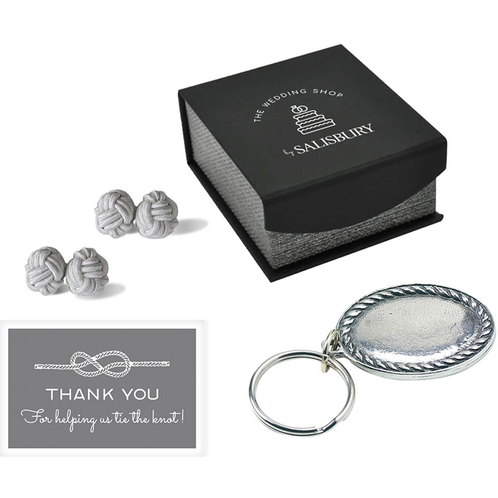 A pewter rope key ring and knot cuff links make for a handsome set. After all, your groomsmen are your tightest friends showing the ultimate act of caring by standing by you on your wedding day. Show them some love with an unforgettable stunning gift! Of course you need a card too! This one says “Thank you for helping us tie the knot!”