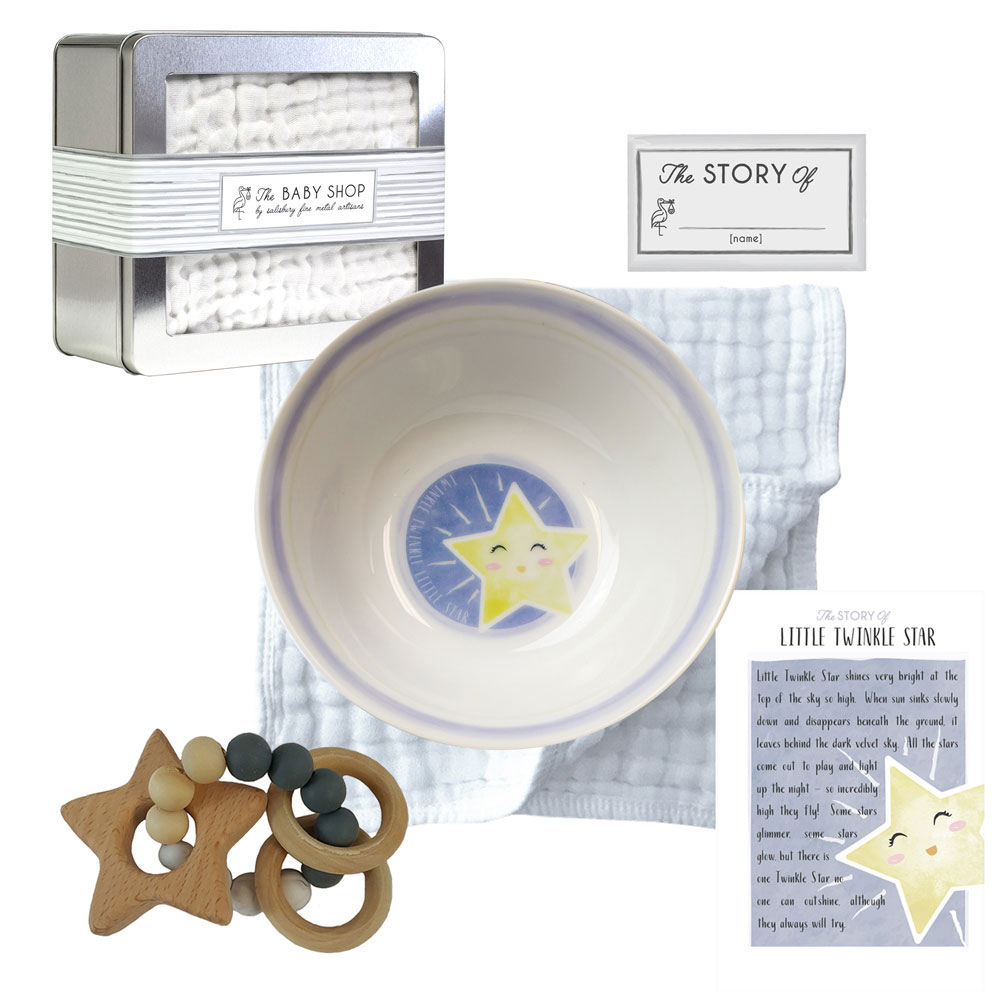 Truly a dynamic duo! This set shows off the star design based on “The Story of Little Twinkle Star” on a ceramic bowl. This set also includes a coordinating wood and silicone teether. Fill in the baby’s name on ‘The Story of You’ sticker and place it on the tin box. As a result, you have the perfect place to keep all of your baby’s treasures.