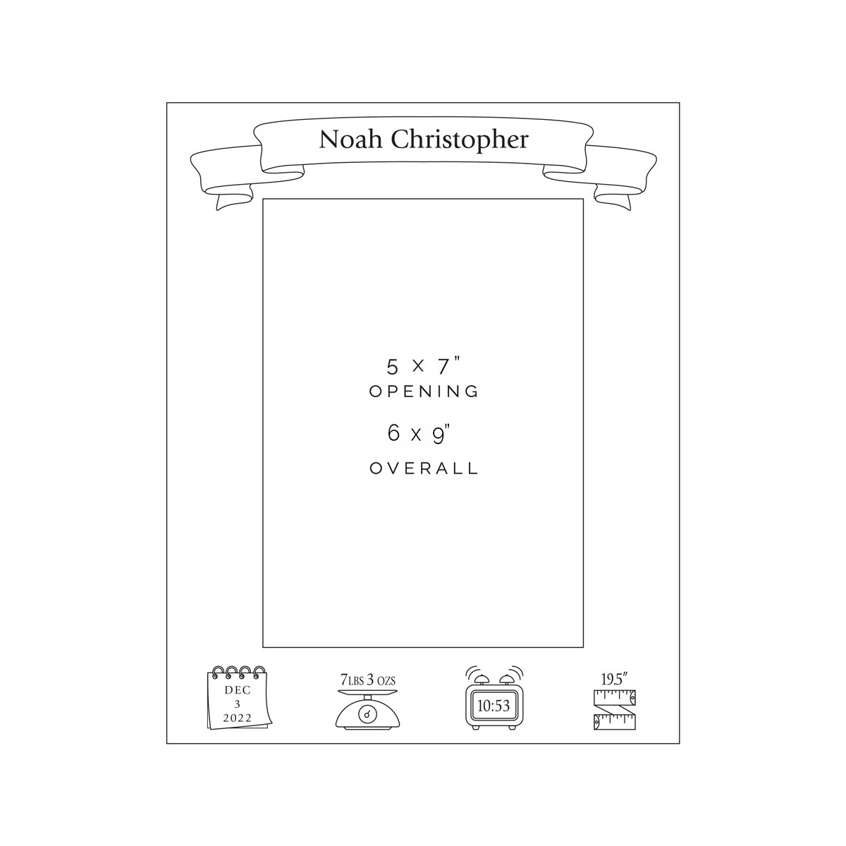 Wide border pewter frame personalized with name, date, weight, and time of birth.